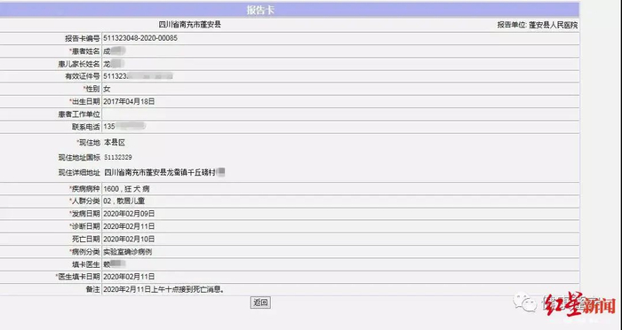 蓬安当地卫健部门公布的一张医院关于萍萍身份信息的“报告卡”上写到:萍萍生于2017年4月18日;死于2020年2月10日;疾病病种:狂犬病。萍萍去世那天,距她3岁生日,还有67天。