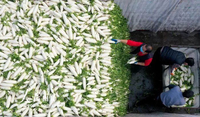 2月5日,四川省南充市嘉陵区河西镇蔬菜产业园的村民们将刚从地里采摘并洗净的新鲜白萝卜装上大货车驰援武汉。粟玉萍/人民图片