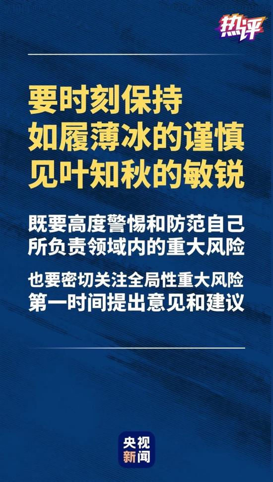 安不忘危、存不忘亡、乐不忘忧。去年1月,中央专门召开了一次“省部级主要领导干部坚持底线思维着力防范化解重大风险专题研讨班”。9月,在中央党校(国家行政学院)中青年干部培训班开班式上,习近平总书记的一段话,可谓语重心长——“领导干部要有草摇叶响知鹿过、松风一起知虎来、一叶易色而知天下秋的见微知著能力,对潜在的风险有科学预判,知道风险在哪里,表现形式是什么,发展趋势会怎样,该斗争的就要斗争”。