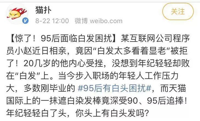 现在很多人生活压力大,不良的饮食作息,不到中年也开始有白头发。更有95后因为白发太多,被相亲对象嫌老,遭到拒绝上了热搜。