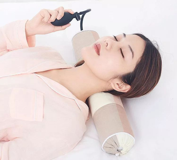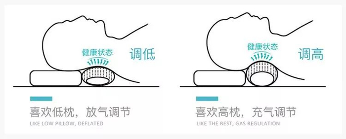 仰卧着枕时,手握住气囊即可充气来调节高度,直到感觉到它与颈椎、头部都能完全贴合为止。