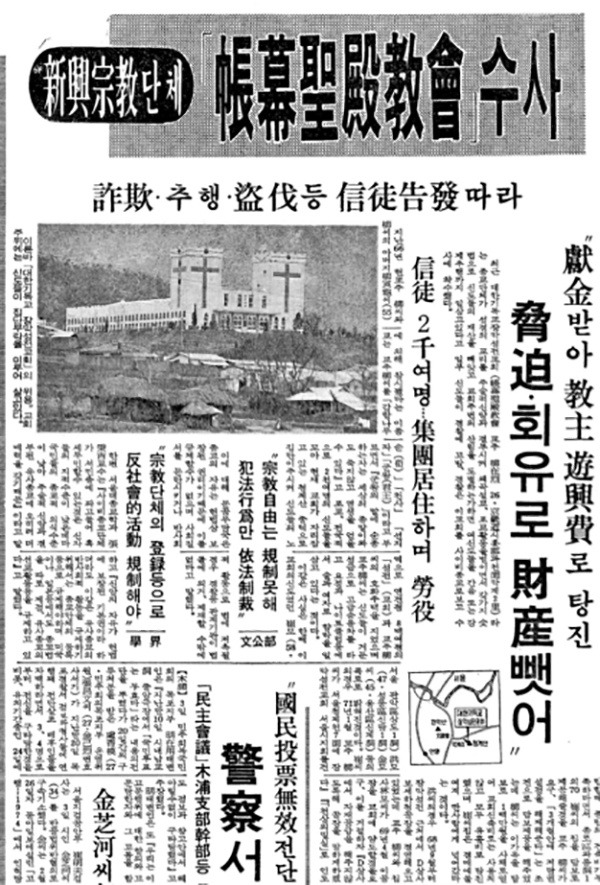 关于帐幕圣殿教会诈骗罪的新闻报道(图片来源:《新興宗教단체 ‘帳幕聖殿教會’수사》,《东亚日报》,1975年4月3日)