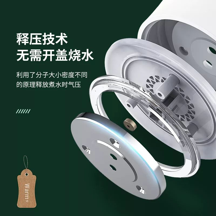 柏翠烧水杯利用分子大小不同的原理自动释放瓶内煮水时的气压。