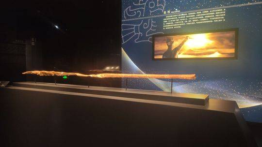 在青铜大立人的左侧,有一条闪着金光的权杖。这是用金条锤打成宽约7.2厘米的金皮后,再包卷而成。金杖上端有46厘米长的纹饰图案,共分三组,一组为两个人头,其上下方有各有一条线,线外则分别是两只鸟和两条鱼。鸟背上各有一支箭,射进鱼的头部。张璐说:“推测鸟和鱼可能分别是两个部落的图腾。最后,两个部落合为了一个。”