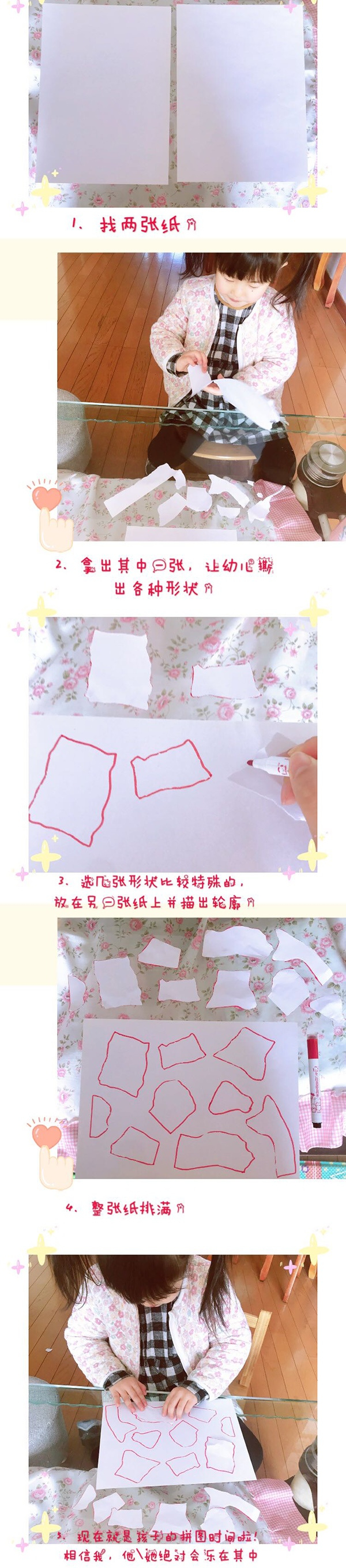 2,拿出其中一张纸让幼儿撕出各种形状。