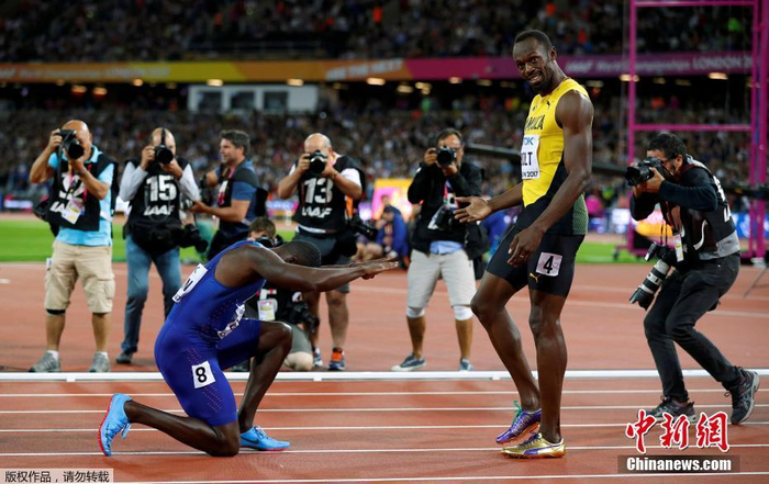 资料图:2017年伦敦田径世锦赛百米“飞人”大战,牙买加“闪电”博尔特在决赛中跑出9秒95的成绩收获铜牌,35岁的美国名将加特林9秒92夺冠,终于圆了自己在大赛上战胜博尔特并夺冠的梦。赛后,加特林在即将退役的博尔特面前“跪下”,表达敬意。