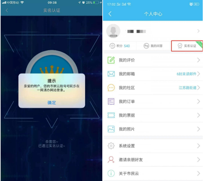4.比对成功,则实名认证成功,账号可在上海市“一网通办”门户同步使用。个人中心显示“实名认证成功”。