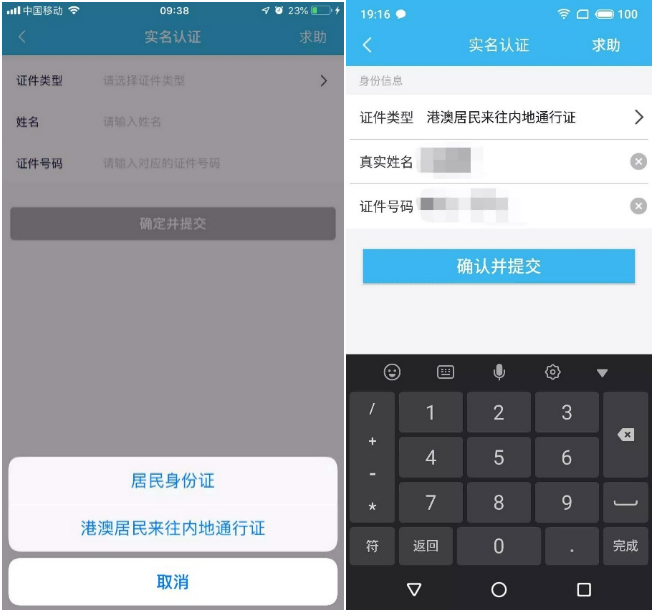 2.“证件类型”选择“港澳居民来往内地通行证”,输入姓名、证件号码进行认证;