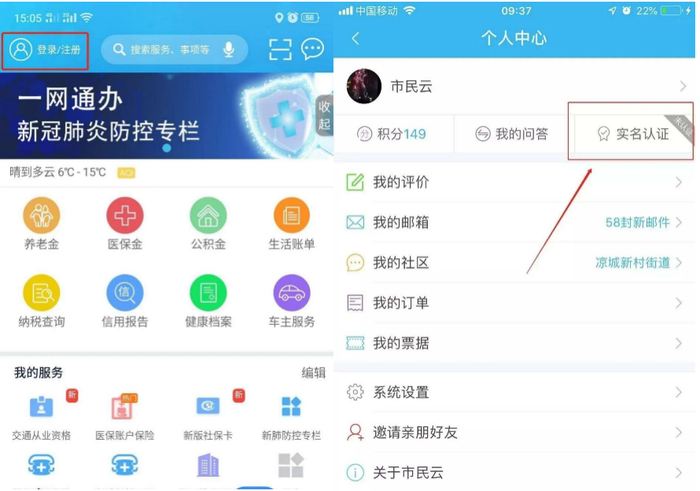 1.在任意主频道,点击左上角头像,进入个人中心;点击【实名认证】进入认证流程;