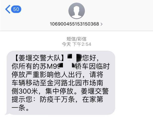 扬子晚报网3月1日讯 (通讯员 张玉成 彭程 记者 王国柱)3月1日下午2时50分,泰州市姜堰城区的王先生收到了一条短信“王**您好,你所有的苏M99**轿车因临时停放严重影响他人出行,请将车辆移动至该路段北侧300米,集中停放。姜堰交警大队提示您:防疫千万条,在家第一条。”