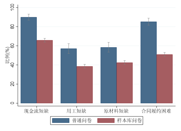 图5:普通问卷与样本库问卷在现金流短缺、用工短缺、原材料短缺、合同履约困难上的占比比较(柱状图中的竖线表示95%的置信区间,如果两个柱状图的竖线不重合,则说明这两组平均值在95%的水平下存在显著差异。)