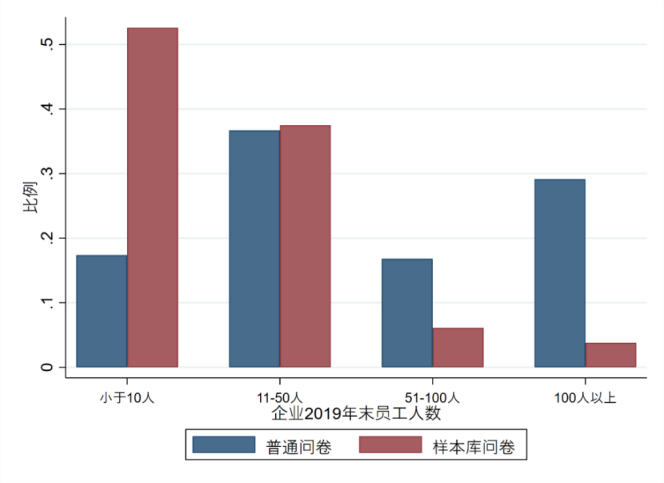 图4:普通问卷和样本库问卷在企业员工人数的分布比较
