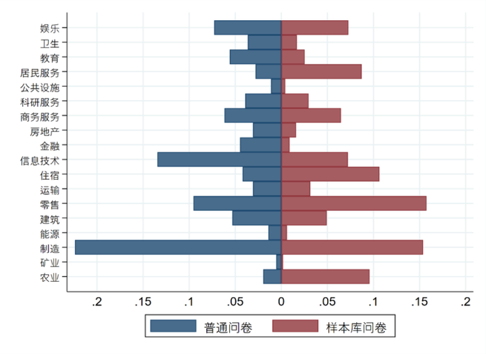 图3:普通问卷和样本库问卷在国民经济一位数行业的分布比较