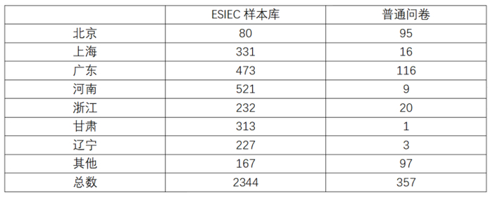 )。ESIEC项目组于2017、2018和2019年通过随机抽样,调查走访了七万余家企业,最终完访8500余家企业。在这次疫情调研期间,ESIEC项目组迅速组织了近百位大学生访员,基于ESIEC样本库联系企业家进行电话访问,或者通过短信、微信等形式发送链接邀请受访者进行问卷填写。普通问卷则通过微信公众号平台以及社交网络传播的形式进行发送,由受访人主动填写。两份问卷的主体内容完全一致。样本库问卷中有7%的样本由于实际经营地址在七个省市之外或者缺失;而普通问卷中27%的样本分布在七个省市之外。