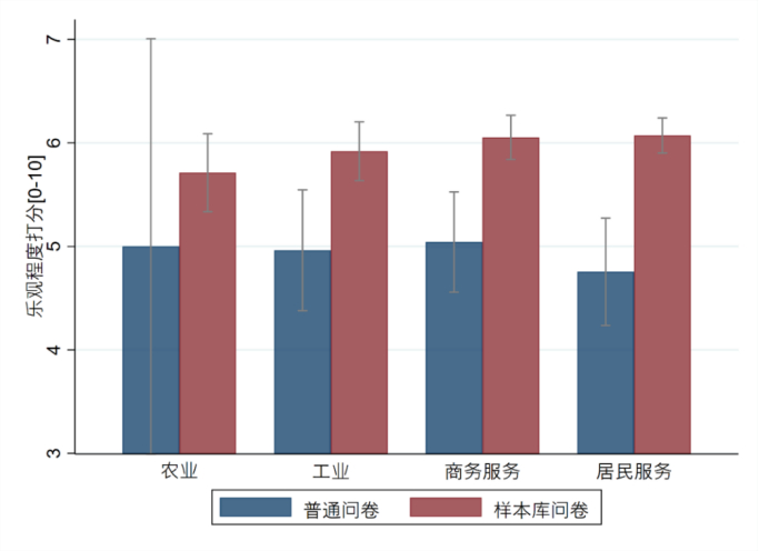 图11:普通问卷和样本库问卷在区分行业之后乐观程度的评分比较