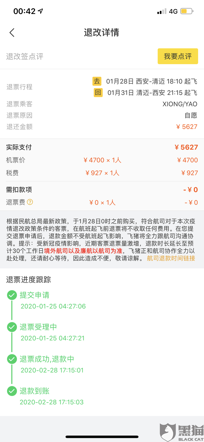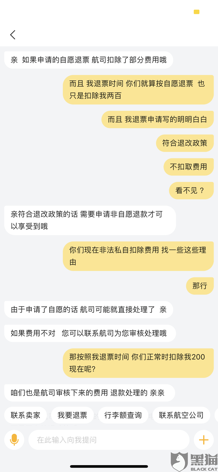 黑猫投诉:疫情期间 私自扣除消费者资金 不予退款