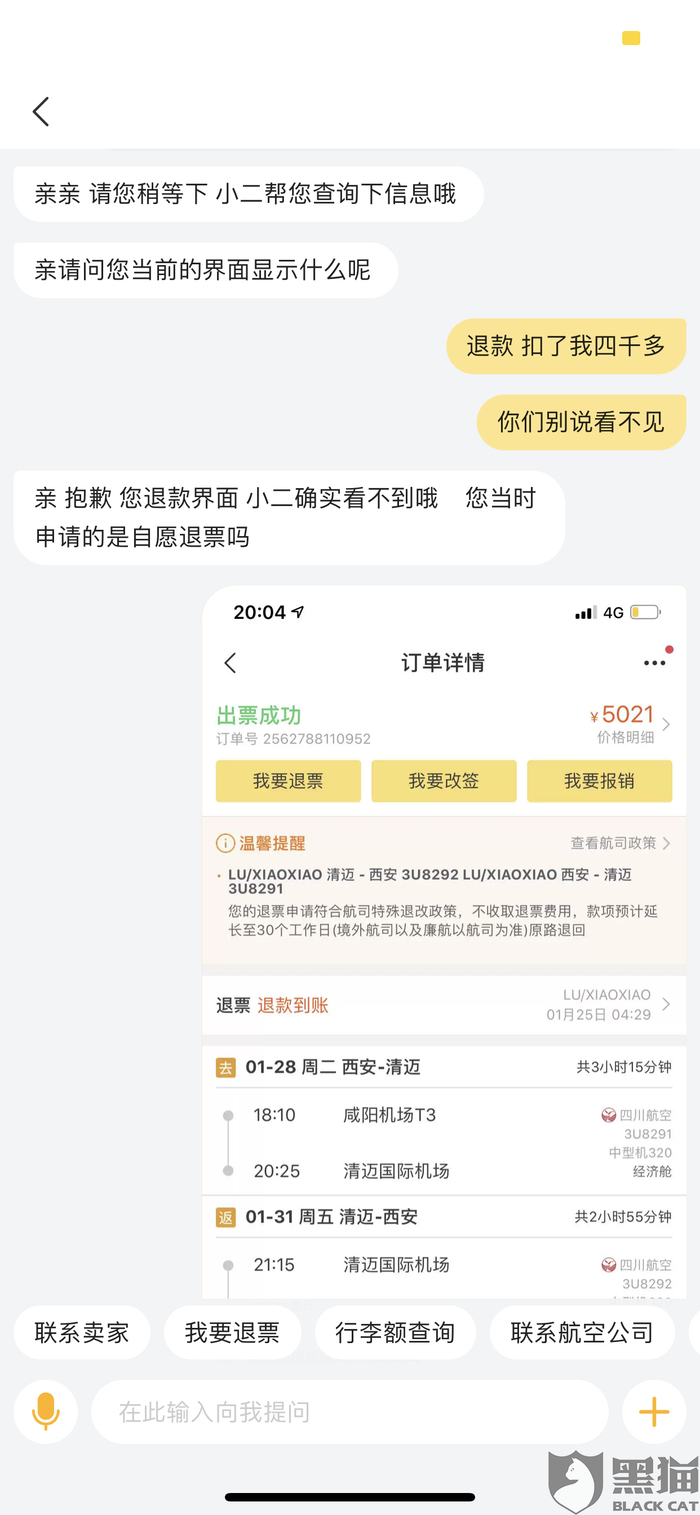 消费者“用户7404266913”在3月2日向黑猫投诉平台反映:“在正常退票 机票未使用的情况下 飞机起飞24小时之前提交退票订单 显示符合特殊退改政策 不收取任何费用的情况下 私自扣除金额 不予以解决和退款。”