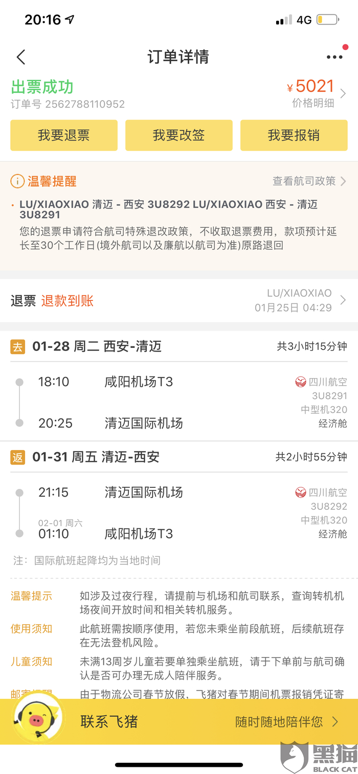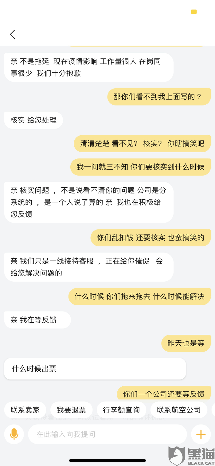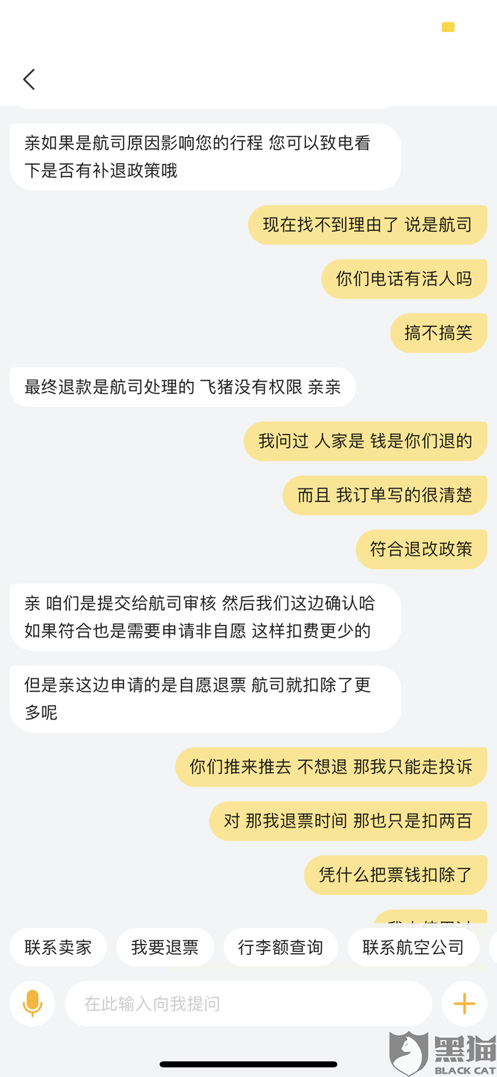 消费者“用户7404266913”在3月4日向黑猫投诉平台再次反映:“飞猪以各种理由推来推去 根本没人给解决 ,网上询问他们客服 永远在和你绕圆圈 ,把责任推来推去。 现在反而拿疫情说话。真把国家疫情放眼里 就不该私自扣除客户的钱。我当时购买的两张票 ,同时退款 同样选择的自愿,但顺利退款,现在飞猪以超过航班起飞时间的理由扣除我的费用。实在无法容忍,就没有相关部门对这样的公司严打吗?”