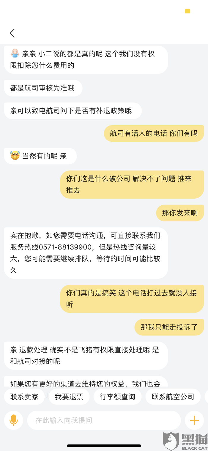 消费者“用户7404266913”在3月4日向黑猫投诉平台再次反映:“打电话 根本没人接听 等了很久 好不容易接听 就会以 “不知情,没权利。这样的话来搪塞。飞猪嘴里说的 致电客服 就是拖延客户的一种手段。根本没有一点作用。”