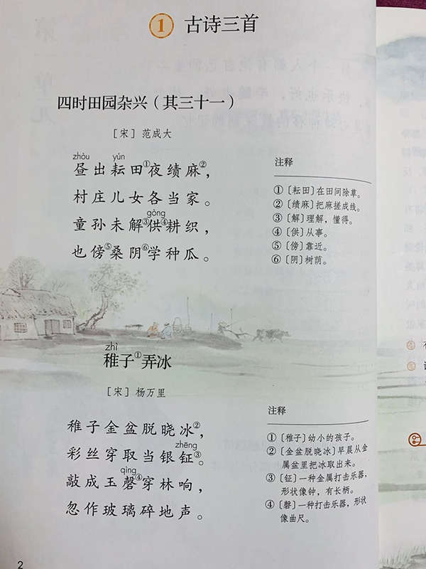 刘叙廷流利地说出了他理解中的三首古诗,第一首《四时田园杂兴》描写了乡村农人耕织以及儿童学着大人的样子种瓜的情景,展现了农家夏忙时热闹的劳动场面,塑造了农村儿童天真、勤劳、可爱的形象,流露出作者对农人的敬重和对热爱劳动的农村儿童的赞美。