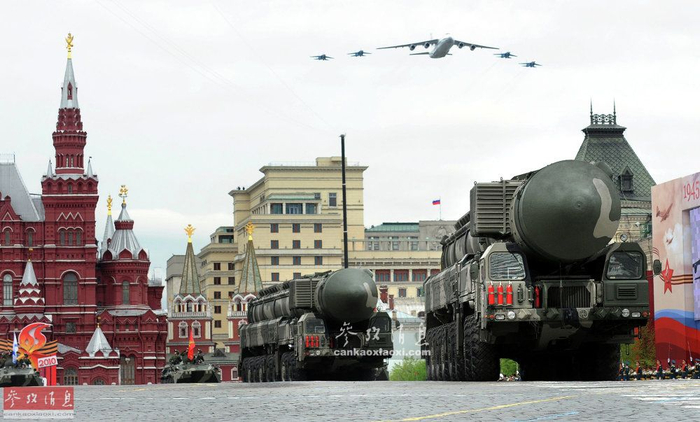 RS-24“亚尔斯”洲际导弹发射车方队参加红场阅兵资料图。