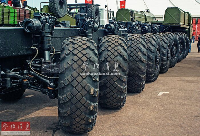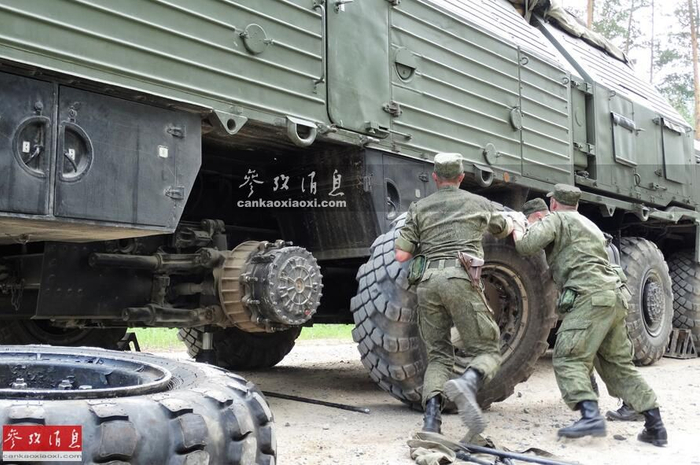其配备的每个轮胎的直径都相当于一个成年人身高,且全采用双叉臂独立悬架,具有较强的越野通过能力。图为俄军整备兵为导弹发射车更换轮胎,更换一个轮胎需要3人共同协作,可见其尺寸之大。