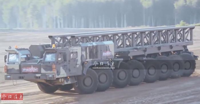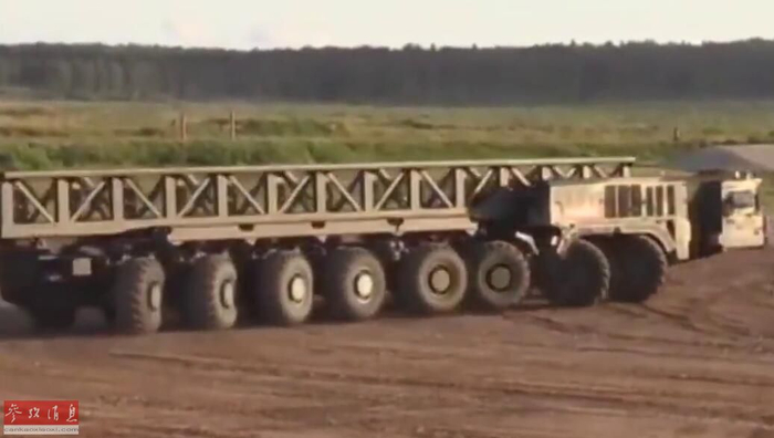 在刚刚开幕的“军队-2018”防务展上,俄军首次展出了由卡玛兹集团研发的KAMAZ-7850“平台O”超重型TEL,该型车采用16X16驱动,即底盘上的16个车轮全能转向。图为KAMAZ-7850展示横向移动能力视频。