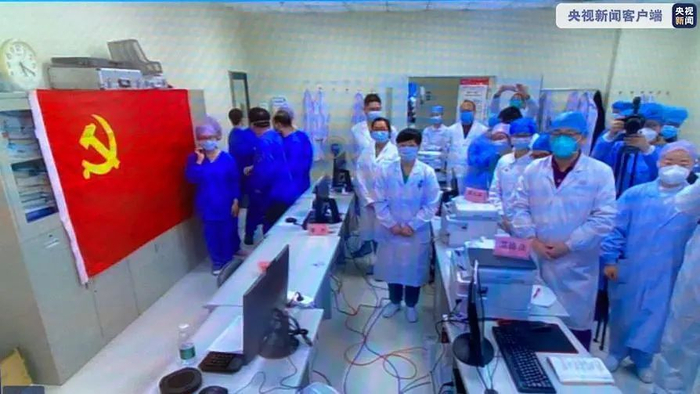 由于李颖贤仍在武汉战场进行支援工作,此次宣誓仪式特别采用远程视频的形式。在钟南山院士的带领下,两位新发展预备党员面对党旗庄严宣誓。