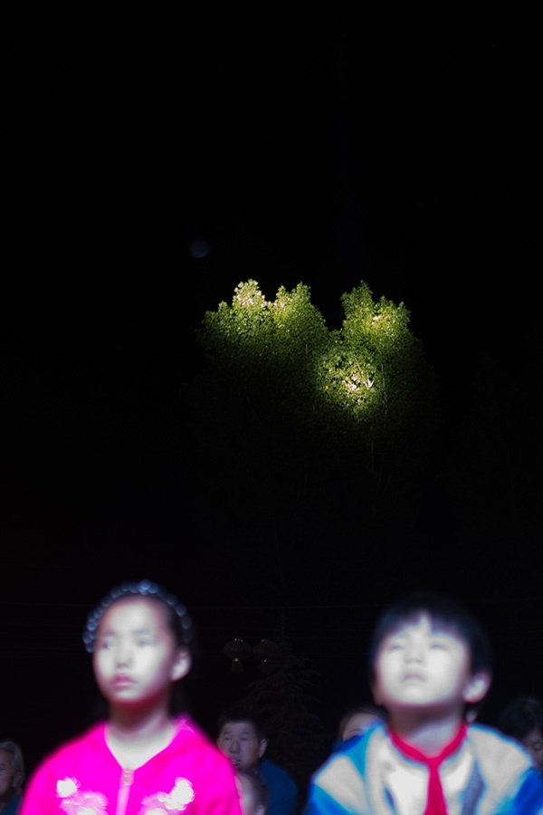2017年5月,陕西省宝鸡市蔡家坡镇安乐村,正在观看商业活动的两个孩子。本文图片均为 澎湃新闻记者 周平浪 图