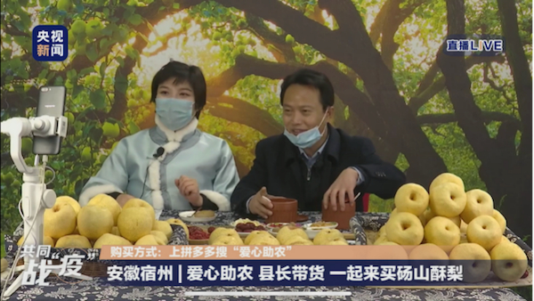 经全国妇联旗舰网站中国妇女网牵线,新电商平台拼多多与央视新闻联合搭台,砀山县政府与安徽鲜果时光商贸有限公司(全国妇女十二大代表、“铁娘子”武妍彦所属企业)、当地农户联合进行直播助农活动,让待销的砀山酥梨直通拼多多平台5亿消费者。除县长之外,砀山县副县长陈新启也来到助农直播间,助力酥梨销售。