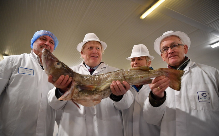 ▲去年12月9日,英国大选倒计时,英国首相鲍里斯-约翰逊访问格里姆斯比当地鱼市,手捧着鱼拍照。新华社发