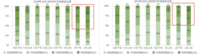 从信德省北部数据来看,2020年1月下旬至2月上旬中高密度和高密度植被占比同比有所下降。1月下旬高密度植被占比为4.67%,与2019年同期的8.21%相比下降约43%,中高密度植被占比同比下降约1/3。2月上旬高密度植被占比同比下降约29%,中高密度植被占比同比下降近10%。
