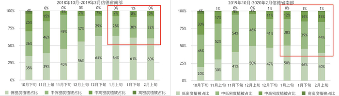 2018年10月-2019年2月、2019年10月-2020年2月信德省北部各密度植被占比