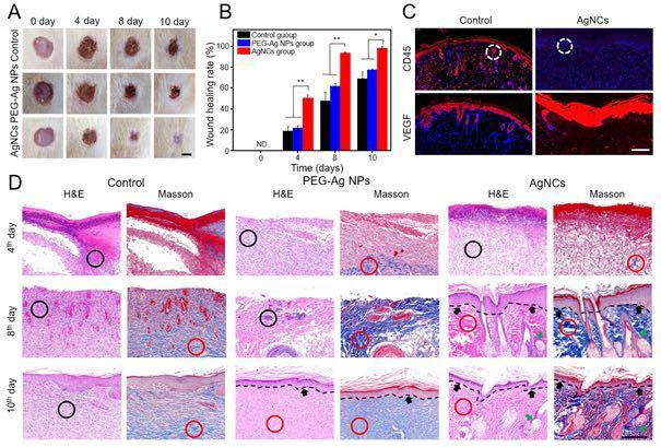 实验结果表明,对耐甲氧西林金黄色葡萄球菌的最低抑菌浓度和最低杀菌浓度分别低至4微克/毫升和32微克/毫升;对大肠杆菌的最低抑菌浓度和最低杀菌浓度分别低至8微克/毫升和32微克/毫升(图1)。该银纳米簇水分散液可喷涂在皮肤创伤表面,对耐甲氧西林金黄色葡萄球菌感染的伤口愈合效果显著(图2)。