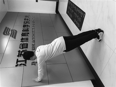 此动作主要针对上肢和胸部力量进行练习。练习时双脚离墙或桌子约两个脚掌长度的距离,站稳;双手手掌撑墙或桌,双手缓慢撑起和放下,力量提高后可以离墙的距离远一些,注意腹部收紧。