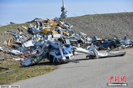当地时间3月3日,美国田纳西州首府纳什维尔遭受龙卷风袭击。图为龙卷风过后,约翰·图恩机场散落的飞机残骸。