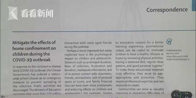 《柳叶刀》杂志3月4日在线发表上海交通大学医学院江帆教授团队的研究文章《减轻疫情期间居家学习对儿童健康的影响》。该文章认为,针对2.36亿中国儿童和青少年已经开始"在家上学",各界需要提高对特殊时期儿童居家学习可能产生的身心健康问题的认识。目前,江帆团队、上海市教委等多部门正在积极推出行动方案,向社会征集各类健康科普资源,整合后融入学生线上课堂内,保障学生身心健康。