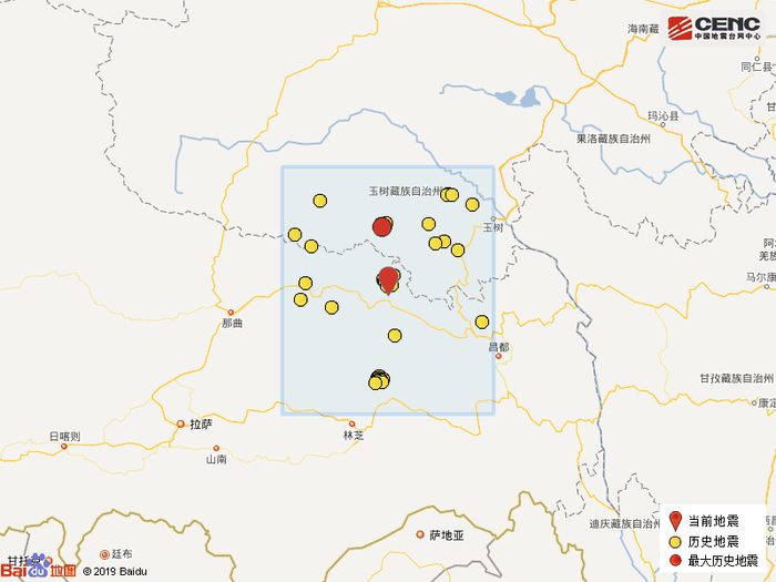 历史地震:根据中国地震台网速报目录,震中周边200公里内近5年来发生3级以上地震共87次,最大地震是2016年10月17日在青海玉树州杂多县发生的6.2级地震(距离本次震中107公里),按震级大小前50次历史地震分布如图。