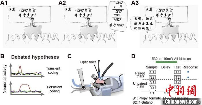 图片说明:(A1-A2) 一个生活中需要调用工作记忆功能的例子和相关的科学问题(A3)。(B)存在争论的两种工作记忆信息存储机制。(C)头部固定的小鼠行为训练装置。(D)一个基于嗅觉刺激的工作记忆行为范式。中国科学院脑科学与智能技术卓越创新中心 供图
