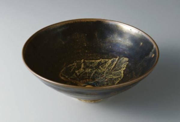 出自南宋吉州窑的木叶纹平茶碗是将树叶放置在茶碗内部烧制而成的陶器,叶片脉络分明且形状完好,黑色铁釉亦不掩其鲜亮色泽。茶碗底座小而开口大,从底部到碗口呈直线放射状,碗沿有金属包边。