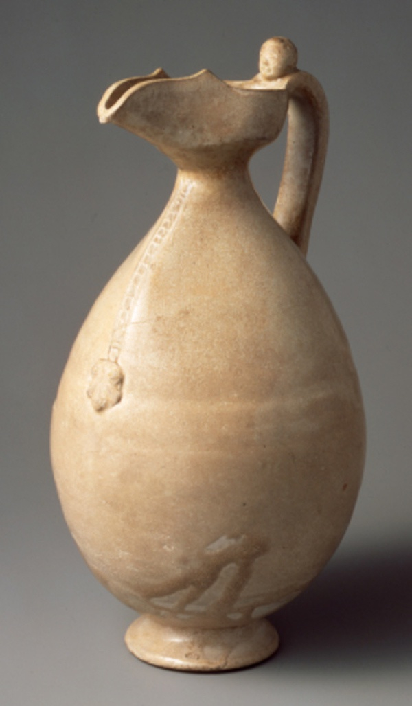 制作于初唐期(七世纪)的白瓷瓣口注水瓶在把手与瓶口的连结处装饰了人头,注水口和瓶身的花纹则是另外制成后粘附上水瓶的,模仿了波斯银器的纹样。据推测,这是今山西省的浑源窑烧制的瓷器,一定程度上体现了关陇贵族阶层的审美趣味,也显示了唐王朝与中亚地区的文化艺术交流。