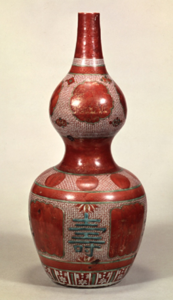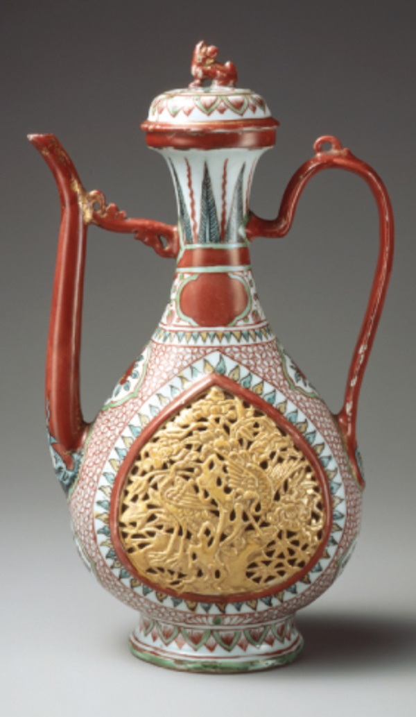 明代嘉靖、万历朝瓷器艺术中发展出金彩技法,即在赤绘或彩绘花纹上使用金箔或黄金色釉进行装饰,制成的瓷器色彩绚烂豪华、炫人眼目。五岛美术馆的金彩藏品中,产自景德镇窑的五彩透雕水壶是日本政府制定的重要文化遗产,壶身部分粘附镂雕的孔雀牡丹图,显示出精巧的构思和高超的技艺;形状较大的五彩寿字花鸟纹葫芦瓶在瓶腰的红釉底上以金彩绘有生动的鹿与花鸟纹样,“寿”字和周边的七宝花纹都描绘得十分精细,红釉与绿色颜料的配合带有沉稳的古风;五彩人物纹水壶是金彩瓷器中造型颇为特殊的一件,瓶身绘有“八仙过海”图案,非常细致地描绘出各位仙人的神态和衣着质感。