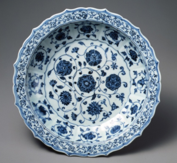 明代宣德年间出产于景德镇窑的青花唐草文轮花盘是典型的“明青花”瓷器。盘边缘绘有单纯的线描式草纹,内侧为花的横截面纹样,盘底则绘制了正面花纹,笔触显得生机蓬勃。内侧盘壁也绘有团花纹样,共同构成了这枚充满装饰性花纹的瓷盘。