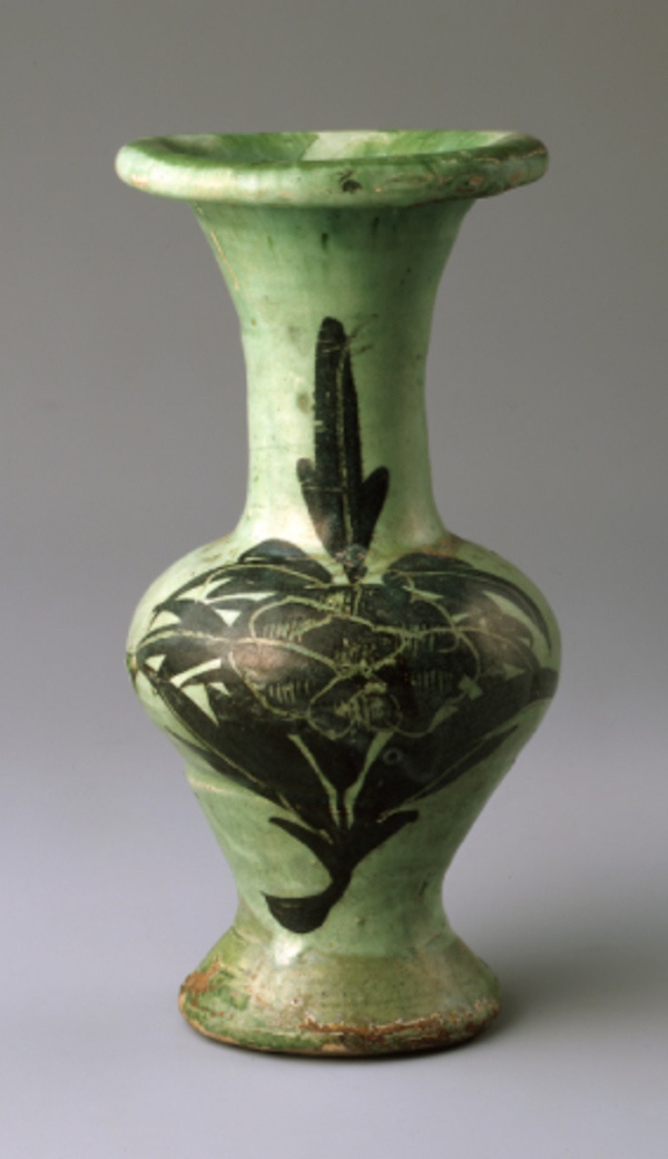 三彩万年壶 唐代白釉黑花牡丹纹梅瓶是宋代具有代表性的民窑磁州窑的产品。制作这类瓷器需要在陶坯上刷上白釉,再涂刷黑釉(呈深褐色的含铁颜料),利用线雕技术刻画出牡丹唐草花纹、并刮去多余部分的颜料。这是北宋磁州窑的流行技法,体现了黑白分明的美感。象征富贵的大块牡丹花纹是北宋瓷器多用的一种装饰性元素。