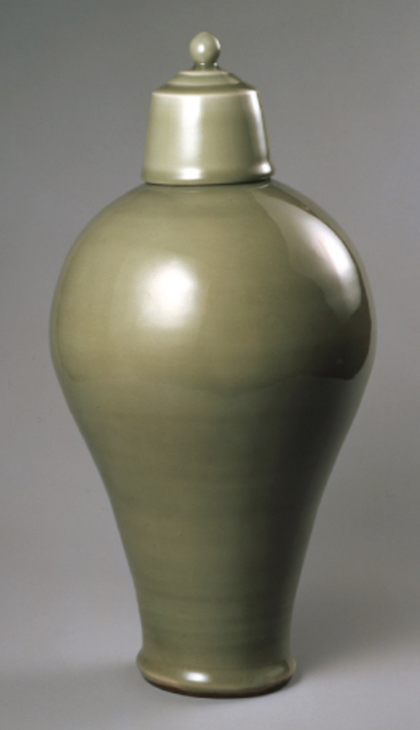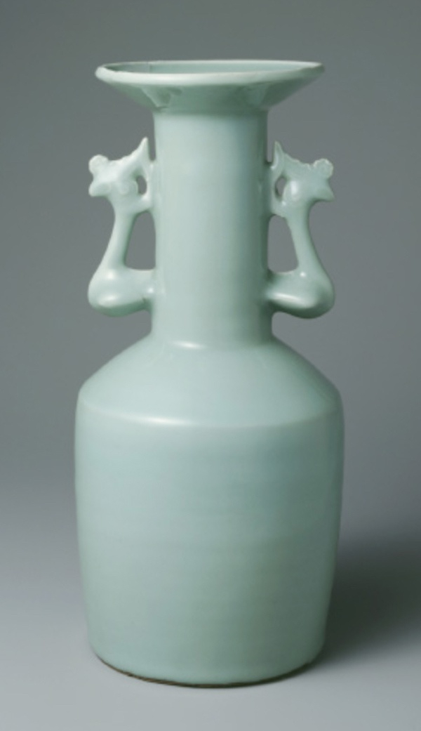 青磁凤凰耳花瓶因呈砧(古代捶打布的工具,多用于洗衣时)形,故又称“砧青瓷”,瓶口呈圆盘形,瓶颈两侧有形似凤凰的把手,在通称“凤凰耳”的同类瓷器中形状最大,气派堂皇,呈现出优雅的粉青釉色,应当出自烧制最高级青瓷的龙泉窑大窑。日本古来将中国舶来的青瓷瓷器分为“砧”、“天龙寺”、“七官三手”,其中“砧”为青瓷中第一等名品。镰仓时代到室町时代(12世纪末期-15世纪末期),龙泉窑青瓷大量传入日本并深受喜爱,大阪和泉市久保惣纪念美术馆所藏“万声”、京都阳明文库所藏“千声”及大阪市立东洋陶瓷美术馆所藏青瓷广为人知。