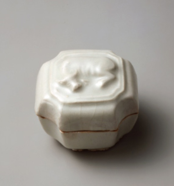 白吴须台牛香盒同样产自漳州窑,呈四方入角形(方角向内凹陷),盒盖表面浮雕出牛的形状,灰白底色上施以略带青色的白釉,展现出柔和的氛围。日本的茶道讲究点茶时熏香,故而江户时期的茶道家们热衷于收藏、赏玩香盒,江户后期的《型物香合相扑》(刊行于1855年,安政二年)以相扑对战形式罗列、评论各种香盒的艺术特色并判定高下,上述三件香盒都名列较高位次,被认定为瓷器香盒中的精品。