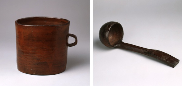 瓦胎黑漆量杯和量勺据传出土于湖南长沙,是在直接烧制的灰色陶器上涂刷黑漆而制成的。使用这种工艺制作的实物现存极少,因而颇为珍贵。量杯的把手由薄板状陶土弯曲后制成,杯身底部还保留着将陶器从辘轳(制作陶器成型时使用的旋转式圆盘)上切割分离时使用丝线的痕迹。量勺则是由圆而深的碗形陶器与厚板型的柄拼合而成,当为量杯的配套器具。作为战国时期的度量工具,这组陶器工艺质朴而注重实用性。朝鲜半岛的乐浪遗址及山东省等地曾出土汉代的类似器具。