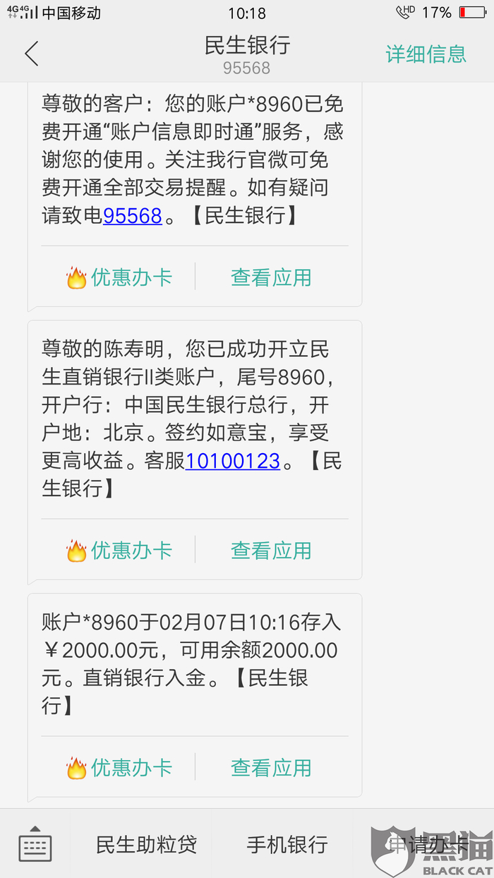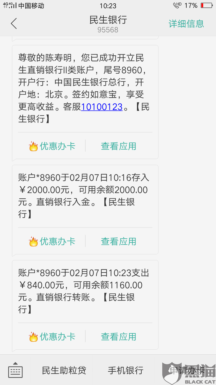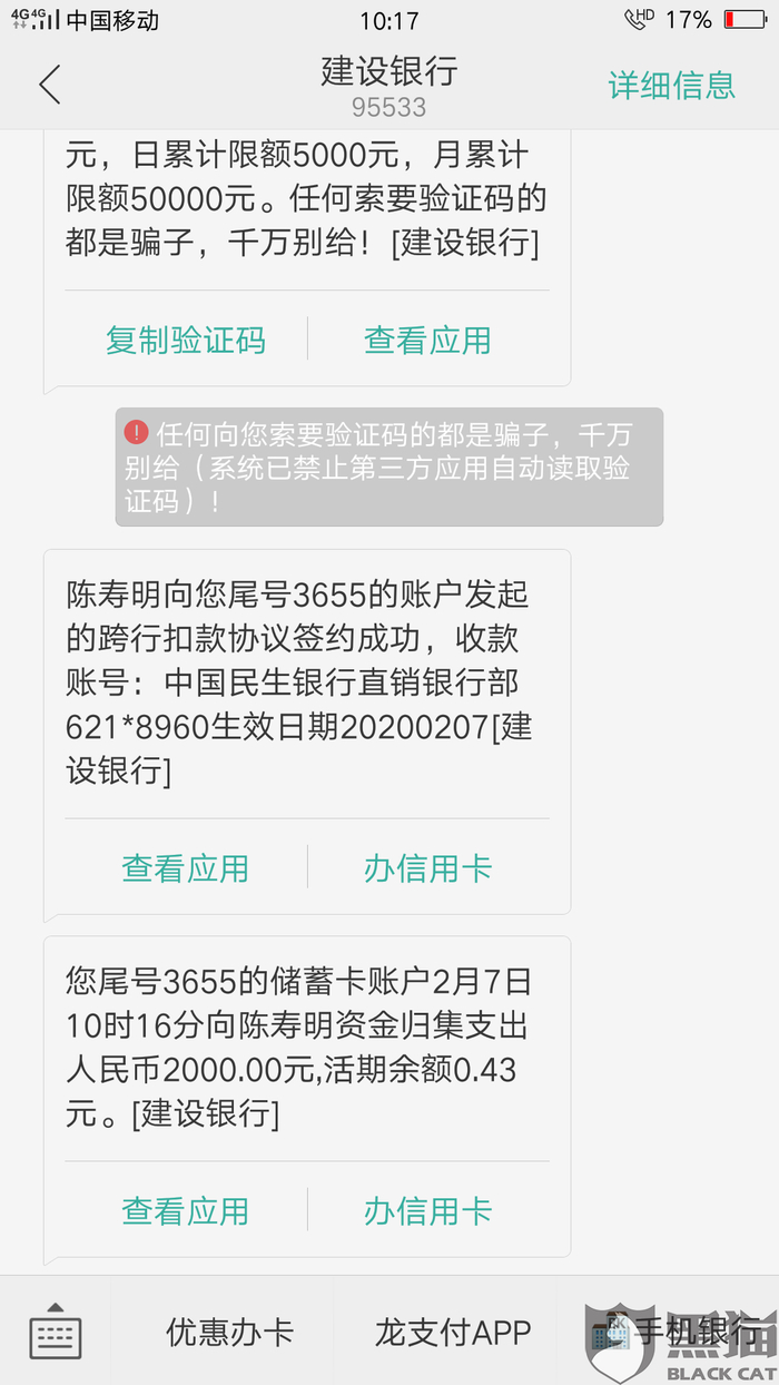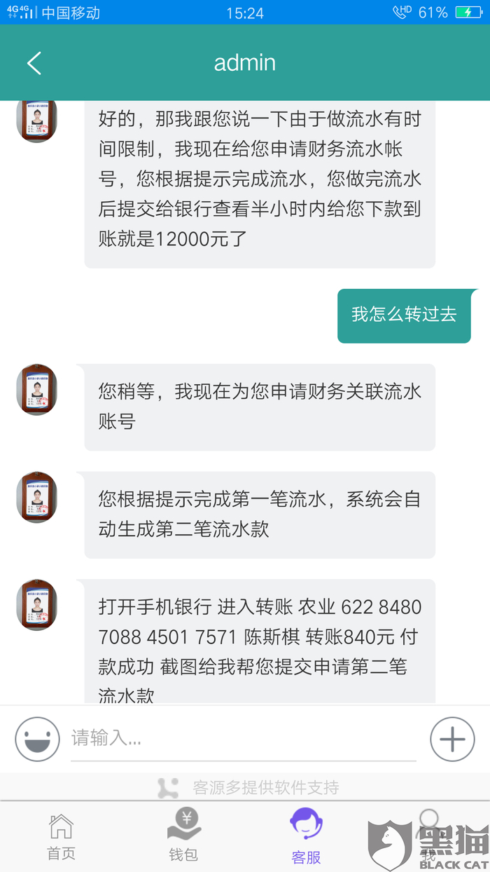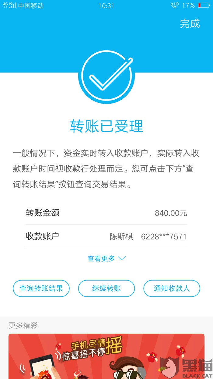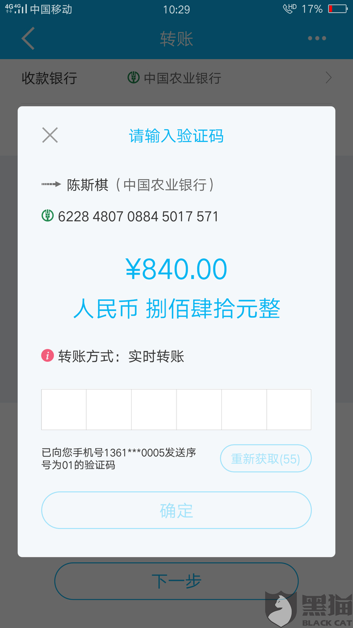 消费者“用户7404294897”在3月6日向黑猫投诉平台再次反映:“以上,农业银行,卡号6228480708845017*** 开户名~陈斯棋”