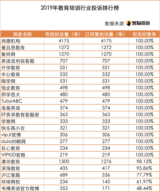 2019年黑猫投诉教育培训行业年度红黑榜