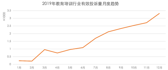 从投诉量月度走势看,2019年教育培训行业的投诉量于12月份达到峰值,有效投诉共3千余单,其主要原因在于尚德机构、中公教育投诉量的激增。